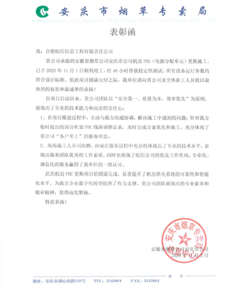 前不久,在安庆烟草机房PDU更换施工项目中,运维团队的表现尤为亮眼。此次施工任务时间紧、技术要求高。团队工程师们主动放弃休息时间,加班加点投入工作,从现场勘查、方案制定到施工实施、验收交付,每一个环节都精益求精。面对施工过程中出现的技术难题,他们沉着应对、反复研讨,最终成功攻克难关,高质量完成了全部任务。安庆烟草相关负责人对团队的专业技术、责任担当和服务效率给予高度评价,并特地向公司发来表扬信,称赞我们:以“安全第一、质量为本、效率优先”为原则,展现出了专业的技术能力和高度的责任心”。客户的信任是我们前行的最大动力,日后,我们会更加精益求精,不负每一份期待。